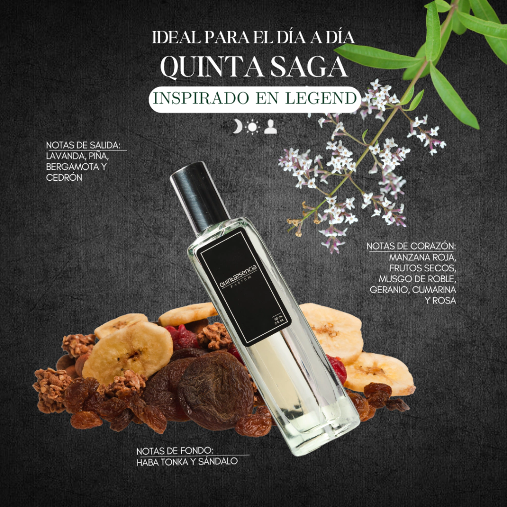 ¿Listo para sentirte como toda una leyenda? El perfume Quinta Saga Inspirado en Legend de Montblanc es justo lo que necesitas. Esta fragancia masculina pertenece a la familia olfativa de los perfumes amaderados y cuenta con una mezcla de notas que te transportarán a un bosque elegante y misterioso. Con toques de bergamota, lavanda, musgo de roble, rosa, geranio y sándalo, este perfume es ideal para el hombre moderno que busca destacar con un aroma sofisticado y distinguido. La salida fresca y cítrica de bergamota se combina a la perfección con las notas florales de geranio y rosa, mientras que el sándalo y el musgo de roble aportan calidez y profundidad a la fragancia. El resultado es un perfume que te hará sentir seguro, elegante y con un toque de misterio que no pasa desapercibido.