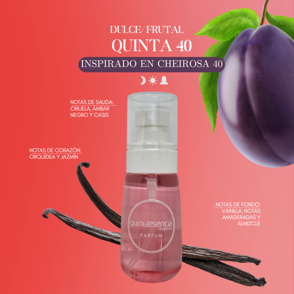 Quinta 40 Inspirado en Cheirosa ’40 de Sol de Janeiro es una fragancia femenina que equilibra dulzura frutal, cremosidad gourmand y una base cálida amaderada. Desde su apertura, notas de ciruela jugosa, ámbar negro y grosella negra aportan profundidad y un carácter atractivo. En su corazón florecen orquídea y jazmín, introduciendo sutileza floral que suaviza la intensidad inicial. Finalmente, se asienta sobre una estela de vainilla, maderas suaves y almizcle, lo que le da una textura acogedora y envolvente. Ideal para quienes buscan un aroma dulce-elegante que funcione para el día a día o para momentos especiales.