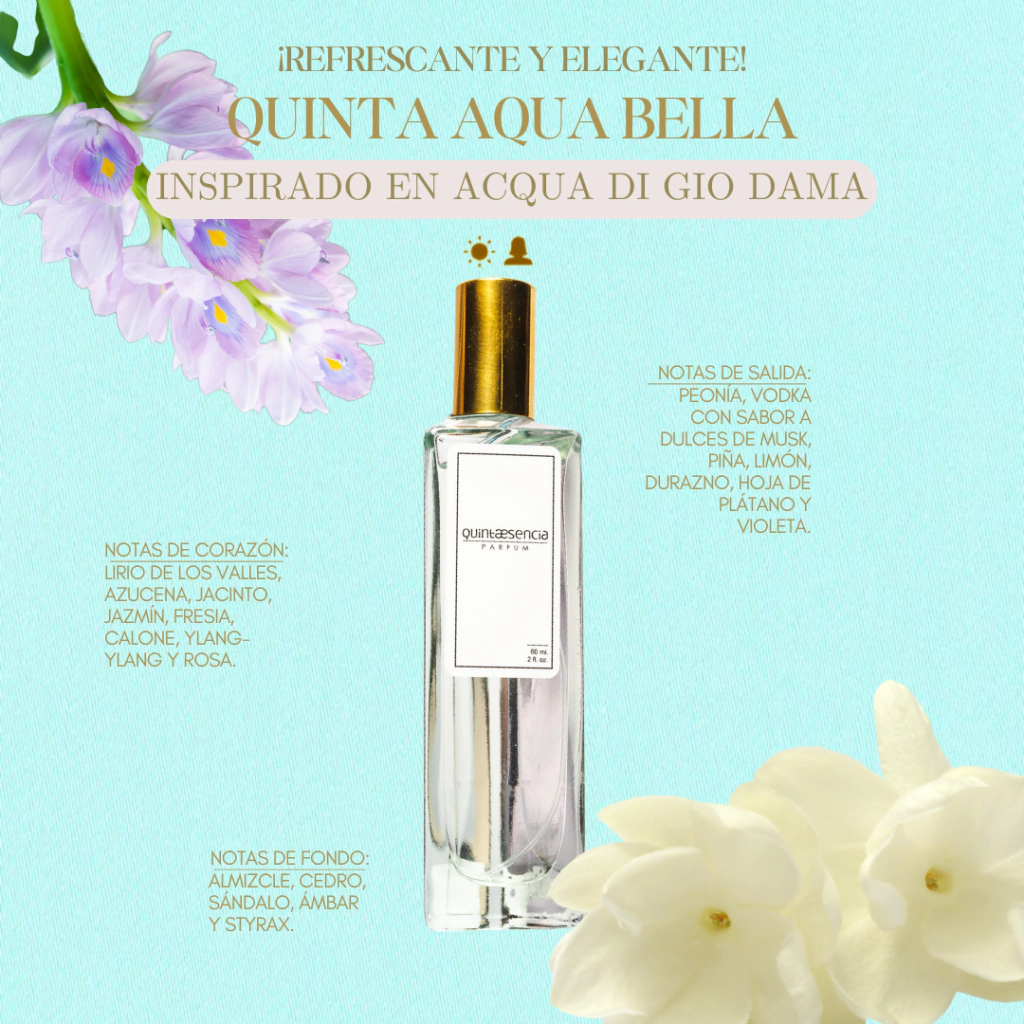 El perfume Quinta Aqua Bella Inspirado en Acqua di Gio Dama de Armani es una fragancia fresca y luminosa que evoca la belleza y la serenidad del mar. Esta fragancia transporta a un mundo de romance y aventura, donde todo es posible.